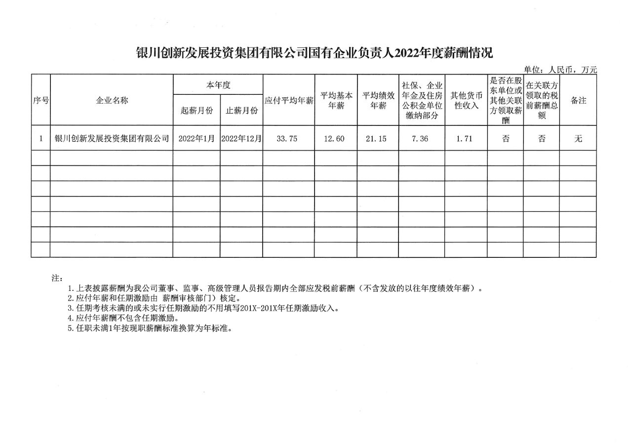 根據(jù)《銀川市屬國有企業(yè)負(fù)責(zé)人薪酬管理辦法(試行)》(銀國資發(fā)〔2021〕458號)、《銀川市屬國有企業(yè)負(fù)責(zé)人經(jīng)營業(yè)績考核辦法(試行)》(銀國資發(fā)〔2021〕459號)、《銀川市屬國有企業(yè)負(fù)責(zé)人經(jīng)營業(yè)績考核實(shí)施細(xì)則(試行)》規(guī)定,經(jīng)銀川市國資委核定,現(xiàn)將銀川創(chuàng)新發(fā)展投資集團(tuán)有限公司企業(yè)負(fù)責(zé)人2022年度薪酬信息予以披露。